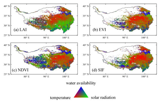 The dominant climate factor that exerted the largest impact on vegetation sensitivity was revealed by comparing the absolute values of the regression coefficients for the three climatic driving factors for each year. For a given pixel in a given year, the climate factor with the maximum regression coefficient was regarded as the dominant factor. The fraction values describing the appearance frequency for each climate factor over the whole investigation period were calculated and were RGB-composited, as shown in Figure 10.