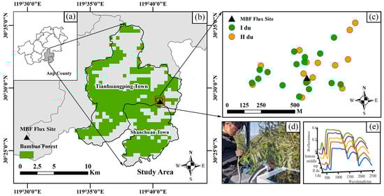 (a) Boundary of Anji County in the study area; (b) bamboo forest distribution and flux tower location; (c) map of the spatial distribution of the sample bamboo; (d) using Li-6800 to measure the A–Ci curve of I du bamboo leaves; (e) leaf spectral curve.