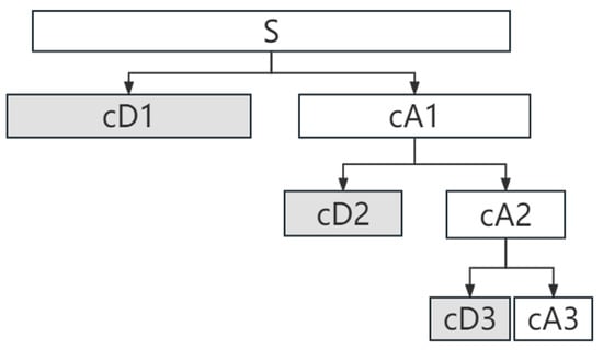 In this study, a DWT was used to decompose the original hyperspectral data of the moso bamboo leaves into coarse-scale approximation coefficients (cA) and fine-scale detail coefficients (cD). cA captures the overall situation of the original spectrum, reflecting the main trend in the original spectrum, while cD provides detailed information of the original spectrum. To maintain cA and cD in the same dimension as the original spectral data, we reconstructed the coefficient vector by upsampling and filtering. Figure 3 shows a schematic diagram of the three-layer DWT decomposition process. Through decomposition, the original spectral data S can be divided into a low-frequency coefficient component cA3 and three high-frequency coefficient components cD3, cD2 and cD1. After wavelet decomposition, the energy feature vector of the original signal can be obtained by calculating the energy information of each node, which can reflect the energy distribution of the signal on different scales [].
