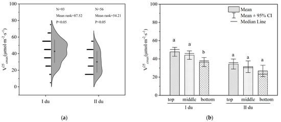 (a) Statistical diagram of the V25cmax of the I du and II du moso bamboo leaves. (b) Statistical diagram of the V25cmax of the I du and II du moso bamboo leaves at the different canopy positions. Letters are the result of multiple comparisons, and different letters represent differences between variables.