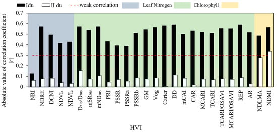 Absolute values of the correlation coefficients between V25cmax and the HVI of the I du and II du Moso bamboo leaves. The correlation below the dashed line can be ignored.