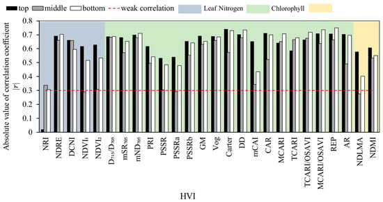 HVIs with the highest absolute values of the correlation coefficients with the V25cmax of I du Moso bamboo leaves at the different canopy positions.