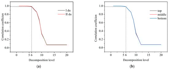 (a) Correlation between the reconstructed signal cA and the original spectrum at the different decomposition levels of the spectra of the I du and II du moso bamboo leaves; (b) correlation between the reconstructed signal cA and the original spectrum at the different decomposition levels of the spectra of the I du moso bamboo leaves at the top, middle and bottom canopy positions.