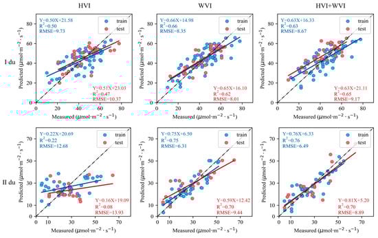 Analysis of Figure 10 shows that the accuracy of the V25cmax inversion model with the WVI as a variable was higher than that of the inversion model with the HVI as a variable, both in terms of the model fitting accuracy (training samples) and model validation accuracy (validation samples). Based on the HVI, the validation accuracy R2 value of V25cmax of I du moso bamboo was 0.47, and the validation accuracy R2 value of II du moso bamboo was only 0.08. Compared to the HVI, the V25cmax validation accuracy was substantially improved when the WVI was used as the input variable. Specifically, the validation accuracy R2 value of the V25cmax of I du moso bamboo was 0.62, which increased by 32%, and the RMSE was 8.01 , which decreased by 22%. The validation accuracy R2 value of the V25cmax of II du moso bamboo was 0.7, which increased by 775%, and the RMSE was 9.44 , which decreased by 32%. Figure 10 also shows that after employing the combination of the WVI and HVI as a comprehensive variable, the inversion accuracy R2 and RMSE values of V25cmax were better than those when employing the HVI. This shows that the WVI could improve the accuracy of HVI inversion of V25cmax, and the model built based on the WVI achieved a high performance, which can be adopted to accurately retrieve the V25cmax of bamboo leaves.