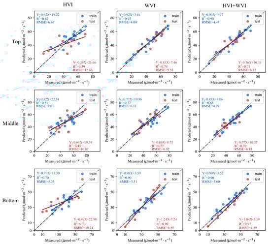 Figure 11 shows the inversion results of the V25cmax of I du moso bamboo at the top, middle and bottom canopy locations. Similar to the V25cmax inversion results for moso bamboo at the different ages, the validation accuracy of V25cmax with the WVI as a variable was higher than that with the HVI as a variable. R2 increased by 90%, 71% and 23%, and the RMSE value decreased by 57%, 36% and 36%, respectively. The validation accuracy R2 of the model constructed by employing the combination of the WVI and HVI as a comprehensive variable was also higher than that when employing the HVI. The R2 values increased by 82%, 56% and 33%, respectively, and the RMSE values also significantly decreased by 51%, 43% and 57%, respectively.