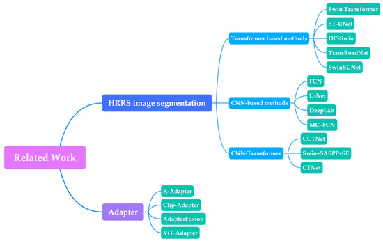 This section describes the related work in CNN-based remote sensing semantic segmentation methods, Vision Transformer, and adapters. Table 1 and Figure 1 show the context of this section.