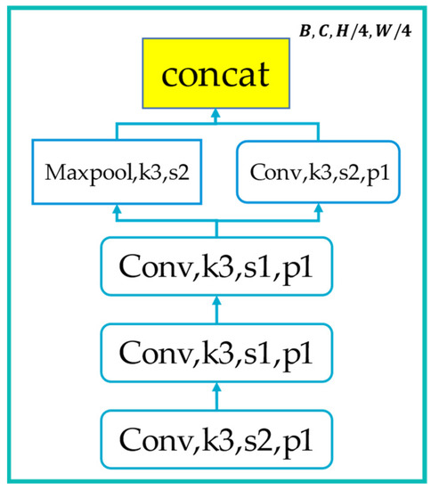 As shown in Figure 2, the first ResAttn module begins with the output of the stem block. The stem block consists of 4 convolutional layers and 1 pooling layer and, as shown in Figure 3, it performs simple feature extraction and down-sampling operations on the input image, which is used to initially reduce the image size and decrease the network complexity.