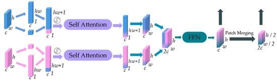 where is the query, , , and are the learnable weight matrices, and the association between the previous layer features and the current features is constructed by self-attention. The output query is then restored to its original size and concatenated, for which we use a convolutional layer to adjust the length to and an FFN module to enhance its nonlinear representation. Finally, the image size and number of channels are adjusted by patch merging.