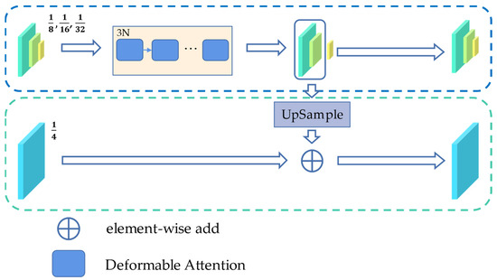 As shown in the Figure 6, the 4-scale feature maps output by the encoder are first fed into the deformer block module. We calculate the weights using 3 N multi-scale deformable Transformers for the offset of the reference points, which are generated by each query in the feature map sizes of , , and , where N represents 2. The deformable attention formula is as follows: