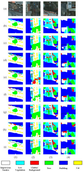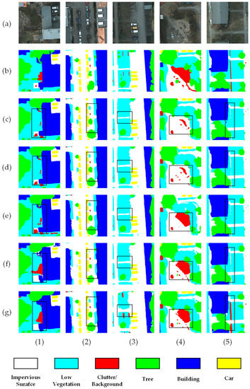 From the black box of row (f) in Figure 9, we can see that the misclassification of “Impervious Surface” and “Low Vegetation” was suppressed; the boundary between different targets was more clearly segmented. The segmentation results of the “Background” category were also closer to the ground truth. This is because after concatenating the output of LFE and ResAttn in the encoder part, the feature map set contained rich global modeling information and local feature information simultaneously, which further improved the model’s ability to discriminate between object features. Finally, after the addition of our modified mask2former-based decoder under the above conditions, the model performance was further improved, which demonstrates the importance of fusing more high-level feature maps into the feature maps in multi-target segmentation.