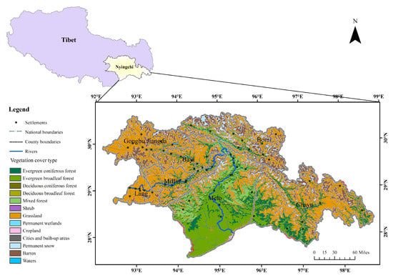 The study area, Nyingchi (Figure 1), is situated in the southeastern part of Tibet Autonomous Region, bordering India and Myanmar, along the middle and lower reaches of the Yarlung Zangbo River. Its altitude ranges from 150 to 7782 m, with the Nyenchen Tanglha Mountains in the north, the Himalayas in the south, the residual ridge of Gangdise Mountains in the northwest, the Hengduan Mountains in the east, and the Yarlung Zangbo Grand Canyon in the center, which is the largest canyon in the world. The relative altitude difference in Nyingchi reaches up to 7627 m, and the terrain slopes from northwest to southeast with significant undulations.