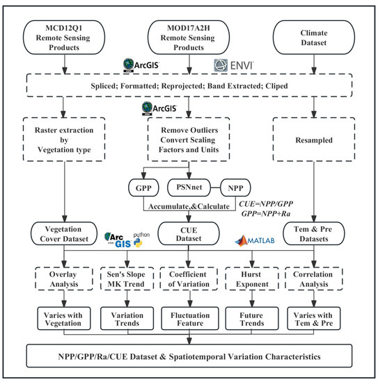 The monthly precipitation (Pre) and mean temperature (Tem) data from 2001 to 2021 in Nyingchi area were obtained from the National Earth System Science Data Center, National Science & Technology Infrastructure of China (http://www.geodata.cn, accessed on 14 August 2022). The temporal resolution and spatial resolution were 1-month and 1 km, respectively. The data were generated by Peng Shouzhang based on the global 0.5° climate dataset released by CRU and the high-resolution climate dataset released by WorldClim, using the Delta spatial downscaling scheme to downscale the monthly precipitation and mean temperature data in China [29]. After obtaining the data, ArcGIS 10.2 software was used for format conversion, reprojection, band separation, and clipping, and finally resampled to obtain the 500 m meteorological dataset in Nyingchi area for 21 years. This dataset was used for testing the correlation between CUE, temperature and precipitation in the subsequent analysis.
