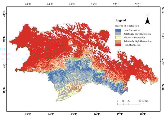 where represents the coefficient of variation of the pixel, is the CUE of the i-th time period, and is the average value of CUE in the study sequence. When the value is larger, it indicates that the data is more dispersed and the vegetation CUE varies greatly; when the value is smaller, it indicates that the data is more compact and the degree of CUE variation is small. Following the grading method of in [33], the regional is divided into five levels: for low fluctuation, for relatively low fluctuation for medium fluctuation, for relatively high fluctuation, and for high fluctuation.