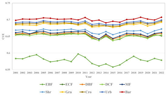 Annual average CUE of various vegetation types from 2001 to 2022 (Wherein: EBF: Evergreen broadleaf forest; ECF: Evergreen coniferous forest; DBF: Deciduous broadleaf forest; DCF: Deciduous coniferous forest; MF: Mixed forest; Shr: Shrublands; Gra: Grasslands; Cro: Croplands; Urb: Urbans; Bar: Barrens).