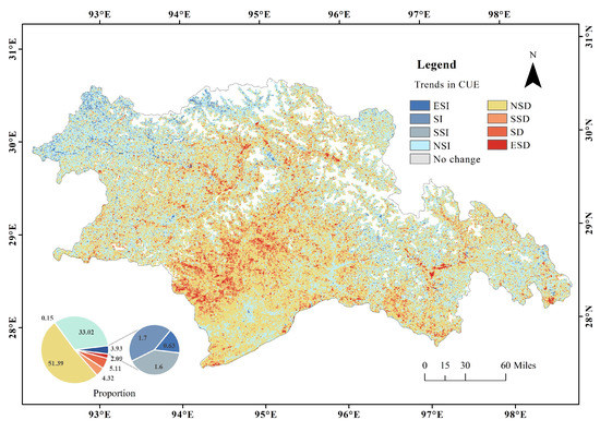 Estimation of Sen’s slope and MK trend analysis were performed on the continuous multi-year CUE dataset, and the results of both analyses were combined to classify the trend change characteristics into 9 categories [42,43]. The distribution and area proportion of each trend change category are depicted in Figure 8. The results show that in 62.91% of Nyingchi, the CUE exhibited a decreasing trend, and 51.39% showed no significant decrease, with the highest percentage being observed in the broadleaved forest, coniferous forest, mixed forest areas, and the transitional zone between forest and grassland in the central part of Nyingchi. The proportion of areas with significant and extremely significant CUE decrease was 7.2%, mainly distributed in the coniferous forest and mixed forest areas near the Himalayas in the southwest of Nyingchi, as well as the mixed forest area in the valley zone of the central and eastern regions. In 36.95% of the area of Nyingchi, the CUE showed an increasing trend, and 33.02% showed significant increasing trend, mainly distributed in the grassland in the north of Gyangze, the middle part of Chayu county in the north of Bomê county, and the broadleaved forest in the south of Motuo. The areas with significant or extremely significant CUE increase were 2.33%, mainly distributed in the grassland and barren at the foothills of the Gangdise Mountains in Nyingchi and the forest-grassland mixed area in the upper reaches of the Yigong and Neyang rivers.