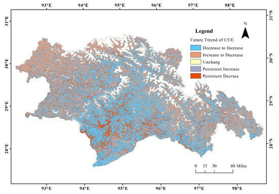 The future trend of CUE in Nyingchi was determined by overlaying the long-term trends obtained from Hurst exponent analysis with Sen’s slope estimation and MK trend analysis results [25], and the results are presented in Figure 10. The analysis revealed that 47.82% of the CUE areas in Nyingchi will experience a trend reversal from decreasing to increasing, which is mainly concentrated in the forest and forest-grass mixed zones on both sides of the river valleys in the central part of Nyingchi. Furthermore, 28.10% of the CUE areas will exhibit a trend reversal from increasing to decreasing, mainly distributed in the grasslands in the northwest and central-eastern parts of the region. The areas with continuous CUE increase account for 8.89% and are sparsely distributed in the grassland in the west and the evergreen broad-leaved forest in the south. The areas with continuous CUE decrease account for 15.15%, mainly distributed on both sides of the Yarlung Zangbo River in the central region, the Himalayan region near the southwestern border, and the Dalan River area in the southeast.