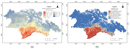 Partial correlation coefficient (a) and significance test results (b) of CUE and temperature.