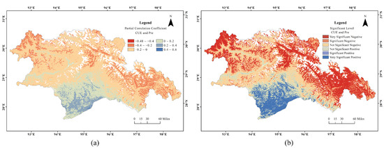 Partial correlation coefficient (a) and significance test results (b) of CUE and precipitation.