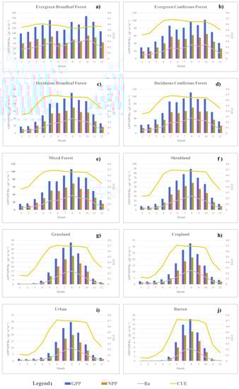 is the amount of carbon fixed by plants through photosynthesis, minus the amount of carbon lost through plant maintenance respiration () [25]. Therefore, can be used to calculate NPP by subtracting the amount of carbon lost through growth respiration (). Based on the algorithm of MOD17A2, the value of growth respiration () is estimated to be 25% of NPP using empirical parameterization [26]. Therefore, NPP can be directly calculated using :