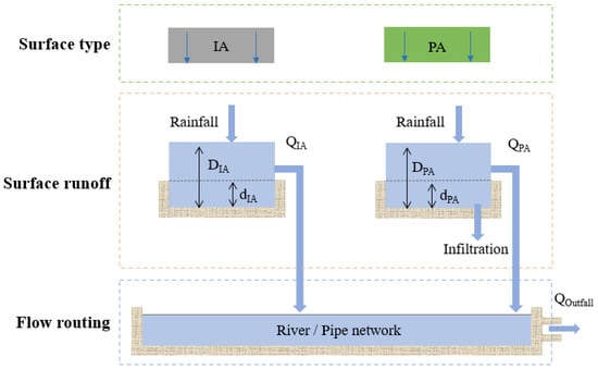 The time variant gain model-urban storm water management (TVGM-USWM), a new distributed urban hydrological model that can describe the hydrological and hydraulic processes in urban areas, was developed in this study. The TVGM-USWM model, based on the time variant gain model (TVGM), considers nonlinear rainfall-runoff relationships and the flow routing in urban drainage systems. The TVGM-USWM model consists of two modules, the urban surface runoff module and the urban flow routing module, as shown in Figure 1. The sub-catchment can be classified into the impervious area (IA) and the pervious area (PA).