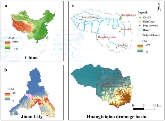 The Huangtaiqiao drainage basin is located in Jinan City (116°11′–117°45′E, 36°02′–37°31′N), China, and its control area is about 326 km2, as shown in Figure 3. The study area consists of the main urban area, the western plain area and the southern mountainous area. The terrain is high in the south and low in the north, with an elevation range of 12–549 m. The river in the area is part of the Xiaoqing River, with the main channel of the Xiaoqing River and its tributaries. The tributaries on the south bank are rain-sourced mountain rivers with a plume-like distribution. The tributaries of the north bank are mainly irrigation channels.