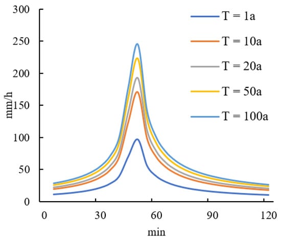 The 120 min rainfall process in five return periods (T = 1a, T = 10a, T = 20a, T = 50a and T = 100a) was selected as the design rainstorm process. The design rainfall processes with different return periods are shown in Figure 4.