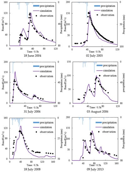In the study, the genetic algorithm was used to calibrate the sensitive parameters of the TVGM-USWM model. The Nash-Sutcliffe efficiency (RNS) was used as the objective function. The floods of 18 June 2004, 2 July 2005 and 3 August 2006 were selected for model calibration, and the floods of 31 July 2006, 18 July 2008 and 9 July 2013 were selected for model validation. Simulated versus observed flood hydrographs in the Huangtaiqiao drainage basin are shown in Figure 5.