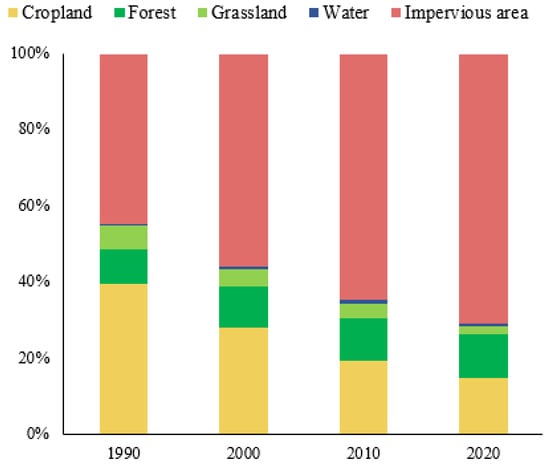 We analyzed the land cover changes in the Huangtaiqiao drainage basin from 1990 to 2020, and the proportions of each land cover class are shown in Figure 6. Over the past 30 years, the area has experienced significant urbanization. The proportion of impervious areas continued to increase from 44.65% in 1990 to 71.00% in 2020, which shows an increase of 1.6 times relative to that in 1990. The proportion of cropland and grassland had continued to decline. The cropland decreased from 39.4% in 1990 to 14.89% in 2020. The grassland decreased from 6.54% in 1990 to 2.1% in 2020. The proportion of forests increased slightly from 9.12% in 1990 to 11.45% in 2020. The proportion of surface water changed very little.
