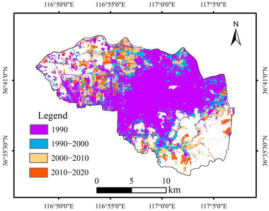 Spatial expansion of impervious area in the Huangtaiqiao drainage basin from 1990 to 2020.
