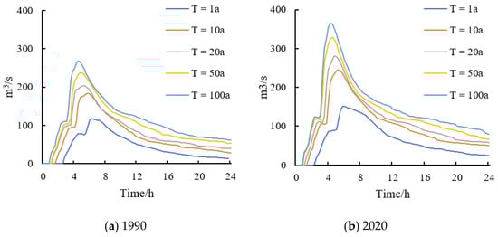 Based on the land cover in 1990 and 2020, two urbanization simulation scenarios were set up in the TVGM-USWM model. The impact of urbanization on rainfall-runoff processes in the area was analyzed under the design rainfall processes with different return periods. The design flood hydrographs for the two urbanization scenarios are shown in Figure 8. The statistical characteristics of the design flood processes are shown in Table 3 and Figure 9.