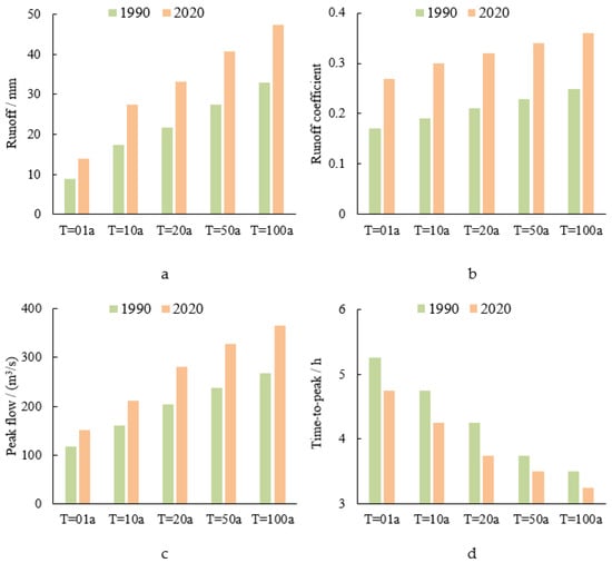 When the return period was 1 year, the values of the runoff coefficient, peak flow and time-to-peak were 0.17, 117.51 and 5.25 in the 1990 urbanization scenario and 0.27, 151.7 and 4.75 in the 2020 urbanization scenario. When the return period was 10 years, these values were 0.19, 161.35 and 4.75 in the 1990 urbanization scenario and 0.3, 211.2 and 4.25 in the 2020 urbanization scenario. When the return period was 20 years, these values were 0.21, 203.31 and 4.25 in the 1990 urbanization scenario and 0.32, 280.81 and 3.75 in the 2020 urbanization scenario. When the return period was 50 years, these values were 0.23, 237.29 and 3.75 in the 1990 urbanization scenario and 0.34, 328.74 and 3.5 in the 2020 urbanization scenario. When the return period was 100 years, these values were 0.25, 268.38 and 3.5 in the 1990 urbanization scenario and 0.36, 364.64 and 3.25 in the 2020 urbanization scenario. Furthermore, as the frequency of the design rainfall decreased, the runoff, runoff coefficient and peak flow gradually increased. The values in the 2020 urbanization scenario were higher than those in the 1990 urbanization scenario. However, the opposite is true for the time-to-peak.