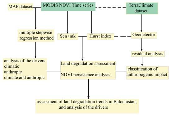 Balochistan Province is the largest administrative region in Pakistan, with 43% of the total land area of the country []. It has very little rainfall [], which makes it one of the regions vulnerable to drought, which causes the most serious land degradation. In recent years, under the influence of climate change and human activities, the climatic and human factors affecting the vegetation cover and ecological environment change in Balochistan—an important hub of natural resources in Pakistan []—and the degree of their impact are still lacking quantitative evidence. Therefore, based on the Sen+mk test, stepwise multiple regression, Geodetector, residual analysis, and the Hurst index, in this study, we clarified the spatio-temporal characteristics of the vegetation difference normalization index (NDVI) in Balochistan Province from 2000 to 2020, and determined and quantified the driving factors of climate and human activities and the spatial distribution of the contributions to the NDVI change. On this basis, the future trend of regional land degradation was predicted. This not only contributes to a comprehensive understanding of the characteristics of Balochistan’s ecosystem evolution, but it is also important for formulating regional ecological and environmental protection policies to serve the global 2030 Sustainable Development Goals.