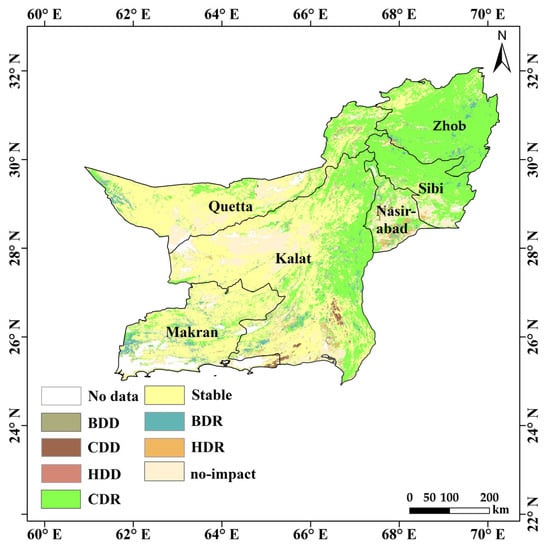 Spatial distribution of driving factors of land degradation and restoration in Balochistan. CDD: climate-dominated degradation region; HDD: human-dominated degradation region; BDD: both factors-dominated degradation; CDR: climate-dominated restoration region; HDR: human-dominated restoration region; BDR: both factors-dominated restoration.