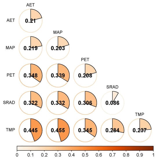 In addition, it can be seen from the interaction of the climate factors (Figure 4) that the dominant interaction force q(X1 X2) is TMP interacting with AET and MAP, which have q-values of 0.445 and 0.455, respectively, indicating that the interaction of the annual mean temperature with AET and MAP has the strongest effect on the NDVI.