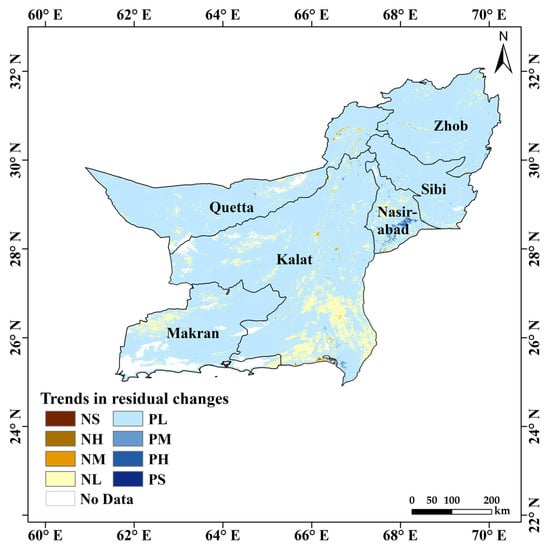 Balochistan is located in the southwestern part of Pakistan, and its southern region has a tropical climate with higher temperatures than other regions outside Pakistan. The administrative areas are mainly located in the arid and semi-arid zones and locally in the extreme arid zone. December to March (winter) and the end of June to the end of September(monsoon season) are the two major rainy seasons in Balochistan. The MAP in Balochistan ranged from 54.78 to 329.67 mm during 2000–2020, with a general trend of decreasing precipitation from northeast to west and southwest. The climate of Balochistan is dry, and rainfall is scarce and unevenly distributed, making the land susceptible to erosion []. There is a large regional temperature difference, with the TMP decreasing from higher than 29 °C in the southwest to lower than 21 °C in the northeast. The rate of the annual mean temperature change in Pakistan shows a spatially decreasing trend from the southwest to the north and east, with an overall fluctuating upward trend from 1979 to 2018, as well as significant warming in most regions, except the northern mountains []. As a result, vegetation growth in Balochistan is limited by the lack of moisture, while the increased temperature causes enhanced evapotranspiration and intensifies drought trends [,]. Ashraf reported that due to the high variability in precipitation, the eastern-central, southwestern, southern and some isolated southern coastal areas of Balochistan would be more vulnerable to severe droughts in the future, especially during winter and alternating wet and dry periods []. This is the main reason for the changes in land degradation due to the NDVI changes in Balochistan.