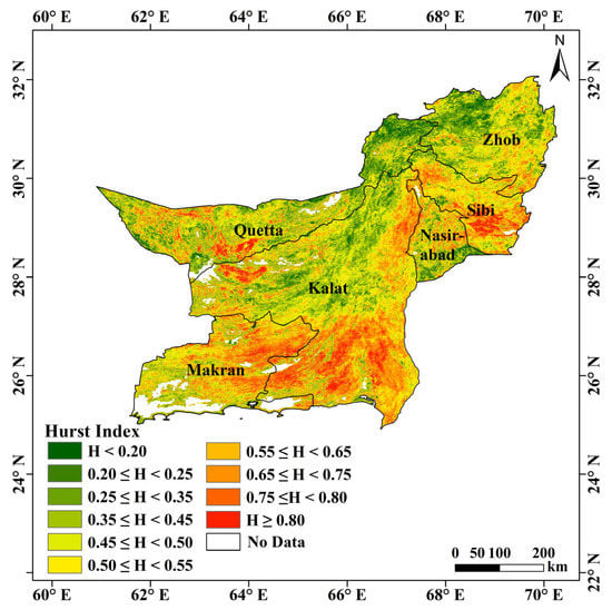 Spatial distribution of Hurst index of NDVI in Balochistan, 2000–2020.