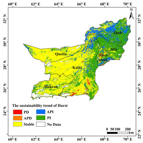Hurst index sustainability trends of NDVI in Balochistan, 2000–2020. PD: persistent degradation; APD: anti-persistent degradation; PI: persistent improvement; API: anti-persistent improvement.
