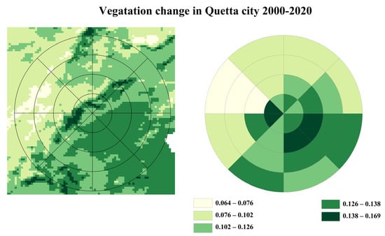 Relevant studies found that land degradation reflected by vegetation was a commonly used practice. Barjeece et al. [] found that the vegetation conditions had improved, with significant vegetation recovery, with a similar trend for the future in Sindh, Pakistan, from 2000 to 2017. Balochistan Province borders Sindh Province to the east. The topography of Balochistan is diverse, and there are significant differences in the natural environment, climatic conditions, socioeconomic development and the intensity and manner of ecological engineering. Therefore, the direction and intensity of the impact of human activities on the NDVI changes show significant spatial and temporal differences. The results of this study show that changes in the NDVI caused by human activities are mainly positive, accompanied by fluctuation and increasing influence. The comparison revealed a strong consistency between the trends of the NDVI in Balochistan under the influence of human activities (Figure 5) and the trends of land degradation and restoration based on the NDVI (Figure 3). This indicates that the growth of the NDVI is not entirely dependent on natural conditions, while various human activities play an important role in the growth of vegetation in Balochistan []. Quetta, in Quetta District, is the capital of Balochistan. Taking Quetta City as an example for illustration, first, the average NDVI values from 2000 to 2020 were calculated. Then, eight radiating buffer zones at 5 km intervals were drawn, with the city as the center of the circle for quantitative analysis of the impact of urban expansion on vegetation change (Figure 8). Finally, the average NDVI values within the rings were counted. The results show that the overall vegetation cover in the urban periphery had a decreasing trend, and the direction of urban expansion was mainly to the north and west, indicating that urban expansion was another driving factor of a decreased NDVI due to anthropogenic activities.