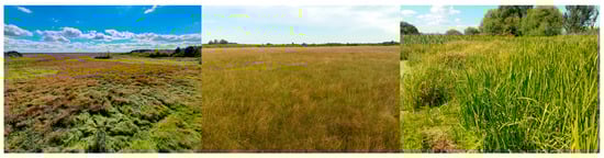 The study area is located in north-eastern Poland (Figure 2). Biebrza Wetlands is a unique ecosystem being under RAMSAR Convention for peatlands, as well as its highly diversified flora and fauna, especially reeds and sedges with grasses. The Biebrza National Park was established (in 1993) within the study area as a wetland site of global networking program NATURA 2000. The study area covers a total area of 59,223 ha of which 45% are wetlands. The area is mostly flat, with an elevation of approximately 105 m above sea level. The Biebrza River, which runs through the area, is a naturally occurring lowland river that provides a distinctive reference point for lowland valley mires and river floodplains [29]. There are approximately 70 various types of natural and semi-natural plants documented in vegetation reports [30,31]. To better understand the ecological value of wetlands, we focused on several dominant habitats, such as rush, sedge, sedge moss, and reed communities. According to the European Environment Agency’s (EEA) latest report on wetlands, certain areas of the wetlands still require restoration, particularly those that have been degraded. Our study investigated three main types of plant communities found within the wetland ecosystem: peatlands dominated by sedges, sedge mosses, and reeds (Figure 1). The research site is situated in one of the coolest regions in Poland, where the average daily air temperature throughout the year is only 6.6 °C due to the prevailing temperate continental climate. The coldest month is January, when the average air temperature is around −4.2 °C, and the warmest month is July, with an average temperature of 17.5 °C. Snow coverage usually lasts for a maximum of 140 days, and the average annual precipitation ranges from 550 to 650 mm. Additionally, the growing season in the wetlands is less than 200 days, making it one of the shortest in the country [32].