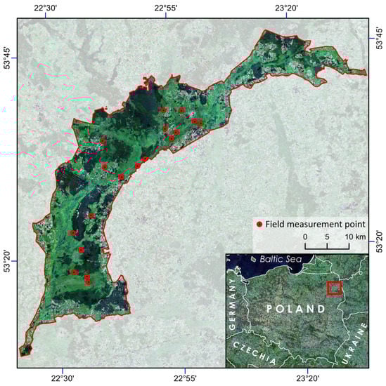 Locations of field measurements conducted within Biebrza National Park highlighted by red dots and presented on Sentinel-2 median mosaic comprising cloudless satellite images from June–July 2022.