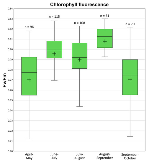 The variations in maximum quantum yield (Fv/Fm) characterizing chlorophyll fluorescence in different vegetation growth periods at the wetlands in 2022 are shown in Figure 4. The most ChF records were made in late June and early July (115), while due to unfavorable weather conditions in the period September–October, only 48 field measurements were carried out. The Fv/Fm reached its maximum value (0.82) at the late flowering stage in August–September. It was noted at its lowest at the late beginning and at the end of the growing season (0.76), in the periods April–May and September–October, respectively. The lowest standard deviations appeared in the mid-season (July–August–September), at 0.010–0.011, whilst the highest standard deviations appeared in the early (April–May) and late stages (September–October) of wetland vegetation development, at 0.026 and 0.029, respectively.