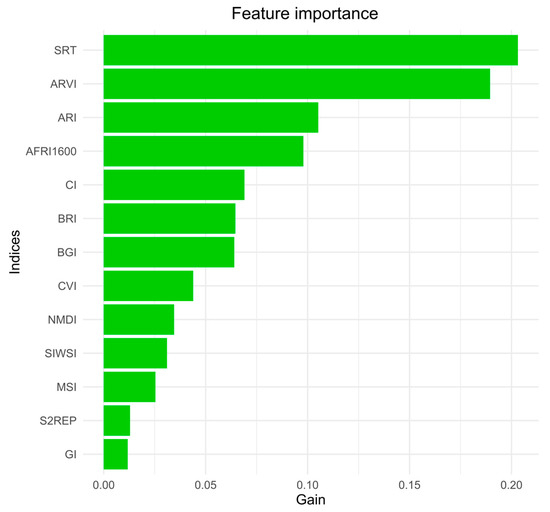 In this study, we examined the use of XGBoost for automating the feature selection process on the initial feature set. The outcome of this process is presented in Figure 6. It can be observed that the Simple Ratio on the 1610 and 2190 bands (SRT) has the highest importance, while the importance of the ARVI is slightly lower. Both indices reflect vegetation growth dynamics and temporal changes in photosynthetic capacity. The vegetation indices ARI, CI, and BRI, which reflect plant senescence, can detect even minor changes in leaf pigments and capture the phenomenon of vegetation browning. When herbaceous plants are exposed to various environmental stresses such as seasonal flooding, high variations in salt levels, low soil oxygen levels, and waves over time, their cell viability and biochemical composition change, which can affect the morphology of leaves, the distribution of leaf inclination, and the structure of the canopy. Therefore, the SRT, which shows healthy and unhealthy vegetation, has a distinct response to environmental conditions. According to a previous study [34], it was found that under saturation conditions, the variation in far-red fluorescence is mainly influenced by the structure of the canopy. The variability in the broadband light spectrum ranging from 641 to 800 nm, which is included in the ARVI and ARI indices, is mainly influenced by the optical properties of leaves and the structural characteristics of the canopy [15]. Finally, these spectral vegetation indices can reflect the vigor of wetland vegetation linked to the changes in leaf and canopy structure and subsequently to chlorophyll fluorescence.