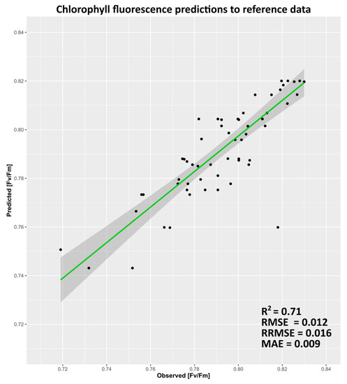 Chlorophyll fluorescence predictions from XGBoost algorithm on validation dataset (abbreviations: RMSE—Root Mean Square Error, RRMSE—Relative Root Mean Square Error, MBE—Mean Absolute Error).