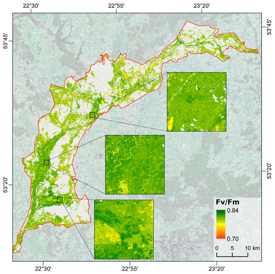 Spatial estimation of chlorophyll fluorescence based on Sentinel-2 June–July mosaic. Areas of interest mapped applying wetland vegetation classification elaborated in previous studies [79,80].