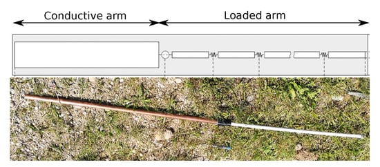 The antenna is built from a conductive arm with a length of 910 mm and the loaded arm with length of 630 mm, as shown in Figure 4. The conductive arm is a copper cylinder that acts as housing for the receiver and transmitter electronics. The loaded arm is a narrow strip, 6 mm in width and an implementation of a discrete resistive Wu-King impedance loading profile (at 25, 27, 125, 175, 225, 275, 325, 375, 425, 475, 525, and 575 mm, a resistance of 77.6, 83.1, 93.8, 103.1, 118.3, 136.2, 160.7, 196, 248.1, 348.8, 563.4, and 1918.6 Ω are inserted, respectively) [37]. The borehole antennas are connected to the proposed nanosecond pulse generator and receiver using coaxial cables.