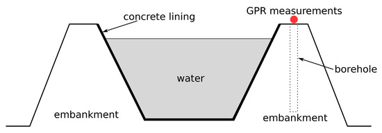 Cross-section of the lined water canal. GPR measurements were performed on embankment made of compacted soil.
