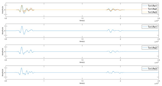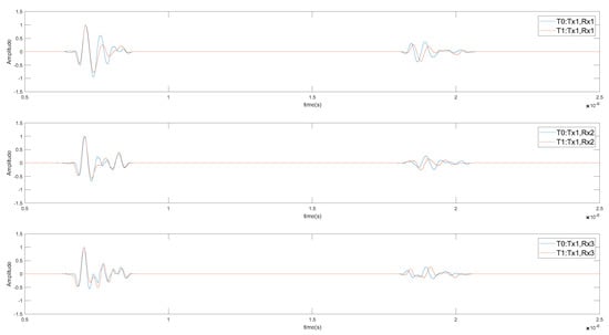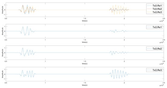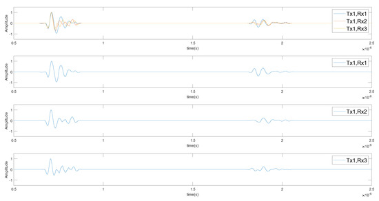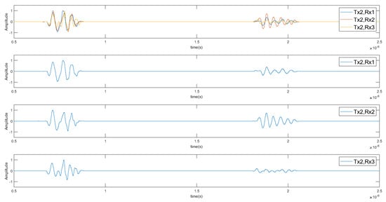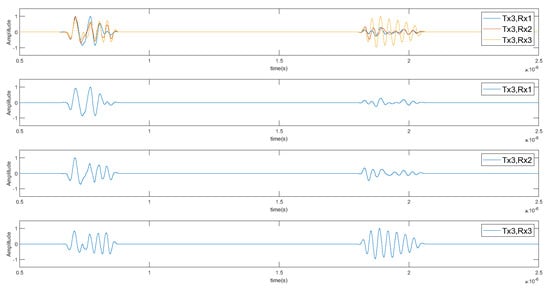 Figure 8, Figure 9 and Figure 10 show the signals received when Tx1–Tx3 are transmitting one-by-one and antennas Rx1–Rx3 are all receiving transmitted signals. The air-coupled signals have a constant delay. Figure 8, Figure 9 and Figure 10 show the acquisition for dry soil condition.