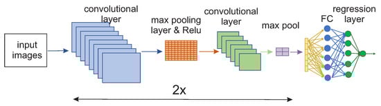 A CNN represent a series of filtering operations to extract features from the data and weight estimation, using regularization layers and closing a network with the fully connected layers. The STFT data are filtered by a series of 2D convolutional filters or kernels, and fed to a non-saturating activation function using the special rectified linear units (ReLU). The structure of proposed 2D regression CNN (2DCNN) is shown in Figure 14. The structure of convolutional layer, max-pooling, ReLU, second convolutional layer, and max-pooling is repeated two times in a series in the proposed 2DCNN, and is followed by a fully connected layer and a regression layer. The 2D convolution extracts features using the local neighborhood. The feature evaluation is based on additive bias, and the result is estimated with the sigmoid function. Features compose the feature map, a 2D image containing the values of the extracted features. The value of extracted feature at position in the j-th feature map in the i-th layer can be estimated as