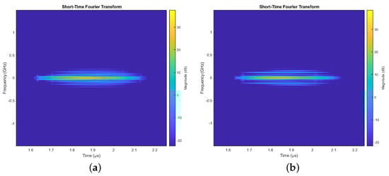 Figure 15 and Figure 16 shows measurements and comparison in dry conditions. The received signal can be divided into an air-coupled signal and a ground-coupled signal. The air-coupled signal represents the first part of the signal that propagates through the air and partly over the ground. The air component is much higher in the amplitude than the ground component. Therefore, we decided to observe just the received signal that propagates over the ground. The 1D signal was sampled using the sample frequency of 3 GHz and the acquisition lasted for 4 μs. Using a 1D signal process (i.e., data series) using CNN, the 1D signal is transformed into a 2D signal or image using STFT. The STFT of the received signal is shown in Figure 17a. The Hamming window of size 1024 samples and overlapping of 1023 samples was used to produce a 2D image 1024 × 1024 pixels in size. The STFT of the received signal on antenna Rx2 using transmitting antenna Tx2 in the dry condition and after 800 L of water were poured into borehole, is shown in Figure 17b. After the event, higher frequencies within the STFT spectrogram were much more visible.