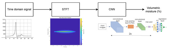 Block diagram of proposed data processing procedure. Time domain signals are acquired and using an STFT transformed into an image. The image is then processed using the proposed CNN structures and the result is presented in volumetric moisture content (%).